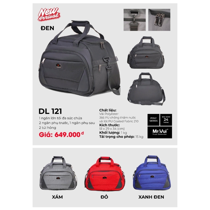 – Bộ sản phẩm đầy đủ: 1 túi du lịch Mr Vui 121 + 1 phiếu kích hoạt bảo hành